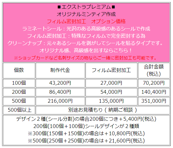 | 詳細説明 | ■エクストラプレミアム■画像2で料金詳細が見れます 加工が異なる3タイプご用意してございます 詳細はこちらのページでご確認下さいませ。 オリジナルミンティア作成 フィルム密封加工 オプション価格 ラミネートシール:光沢のある高級感のあるシールで作成 フィルム密封加工:特殊なフィルムで完全密封する為 クリーンナップ:元々あるシールを剥がしてシールを貼るタイプです。 オリジナル感、高級感を出すならこちら! ※ショップカードなど名刺サイズの物ならご一緒に密封加工も可能です。 ※基本セットはミンティア100個&ミンティアシール100枚です。 ※賞味期限はその都度入荷いたしますので9ヶ月~12ヶ月です。 ※別途で100個+100個=200個(デザイン2種)も可能です。 ※納期 平日営業日中7日~14日以内の後発送になります。 (※スタンダード100個~500個の場合) ※ご入金確認が取れました日をご注文確定日とします ※ご注文確定後のキャンセル・返金はできません ※納品後の返品・交換はいたしておりませんのでご了承下さい |